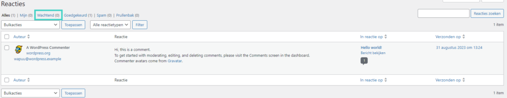 Klik op het tabblad ‘Wachtend’ boven het overzicht om de lijst met reacties weer te geven die wachten op goedkeuring.